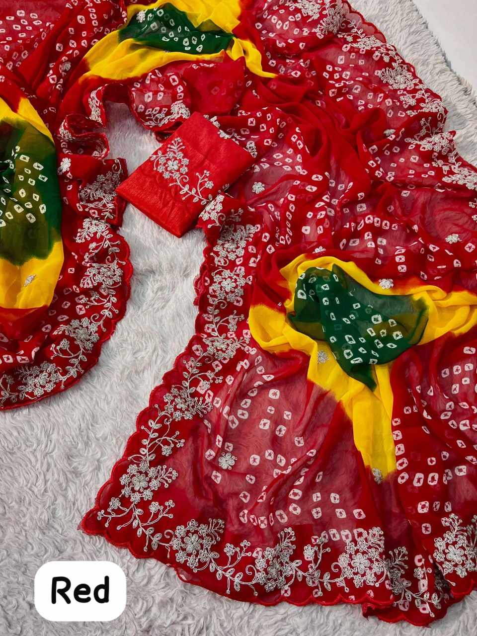 | Name : | PIYU P1038 MULTI COLOR RED BANDHANI Saree |