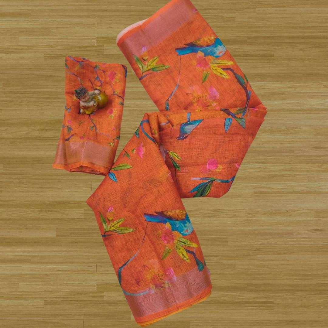S4S Linen Orange Bird Digital Print Cotton Saree