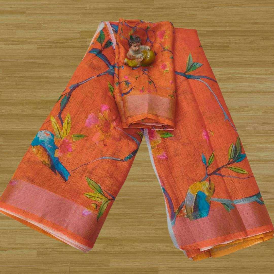 Name : | S4S Linen Orange Bird Digital Print Cotton Saree |